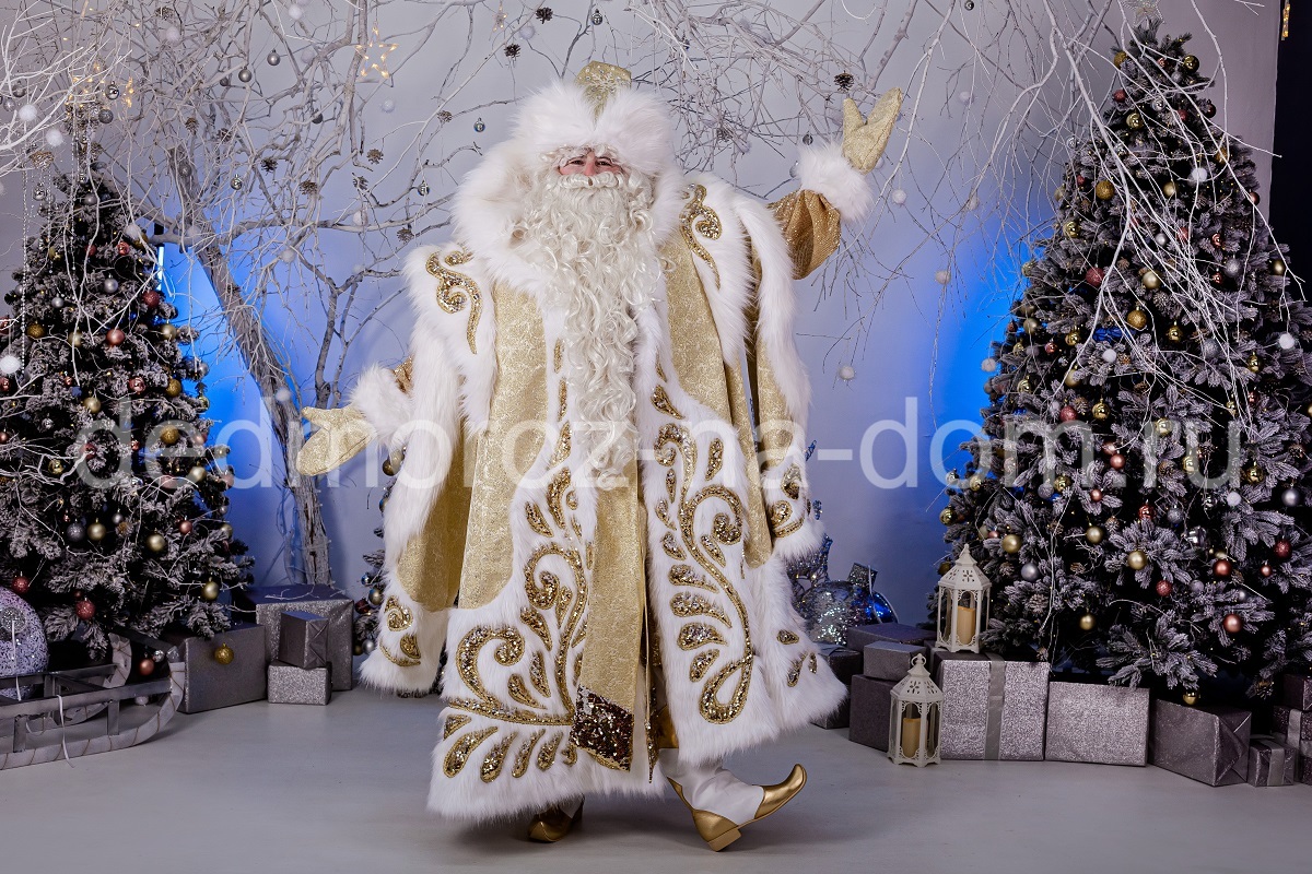 Костюм состоит из двух частей. Первая часть – это шуба. Шуба сделана из красного материала с золотыми узорами. Края рукавов и нашивки на груди выполнены из сверкающей широкой золотой тесьмы. Все края шубы отстрочены белым мехом, меховым является и большой воротник. Под шубой у Деда Мороза находится длинная белая рубашка, которая подпоясывается атласным красным поясом с золотыми кисточками. Этот костюм есть и в синем варианте.