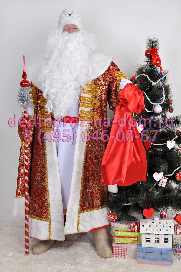 Дед Мороза в красивом «Царском красном» костюме понравится каждому! У костюма боярские рукава, отстроченные мехом. Красивый вид ткани – серебристые узоры, дополняют широкие меховые вставки и золотая окантовка. На голове у Деда Мороза меховая шапка и также ему полагаются красные варежки с серебристыми узорами. Этот же костюм есть и в синем варианте.