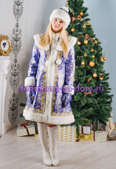 Сочетание белого и синего цвета с характерными узорами не зря дало такое название этому костюму, как «Гжель». Рисунок костюма довольно самодостаточен, но его удачно дополняют белые меховые вставки и пояс и из аналогичного материала. Кроме этого, на Деде Морозе будут также рукавицы и синяя шапка с белым меховым отворотом.